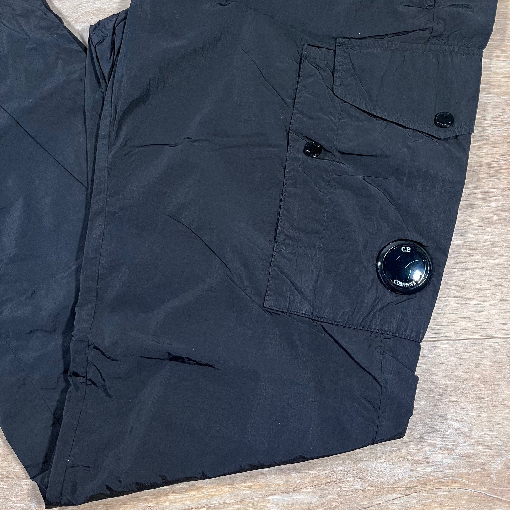 These cargo pants are crafted from Chrome-R, a 100% recycled shiny multifilament nylon made from reprocessed production scraps and certified by the Global Recycled Standard. Garment dyed with an anti-drop finish, they feature a mesh lining for breathability, an adjustable drawstring waistband, and functional side and back pockets. Finished with C.P. Company’s iconic Lens detail, these regular-fit pants blend technical performance with sustainable design.
