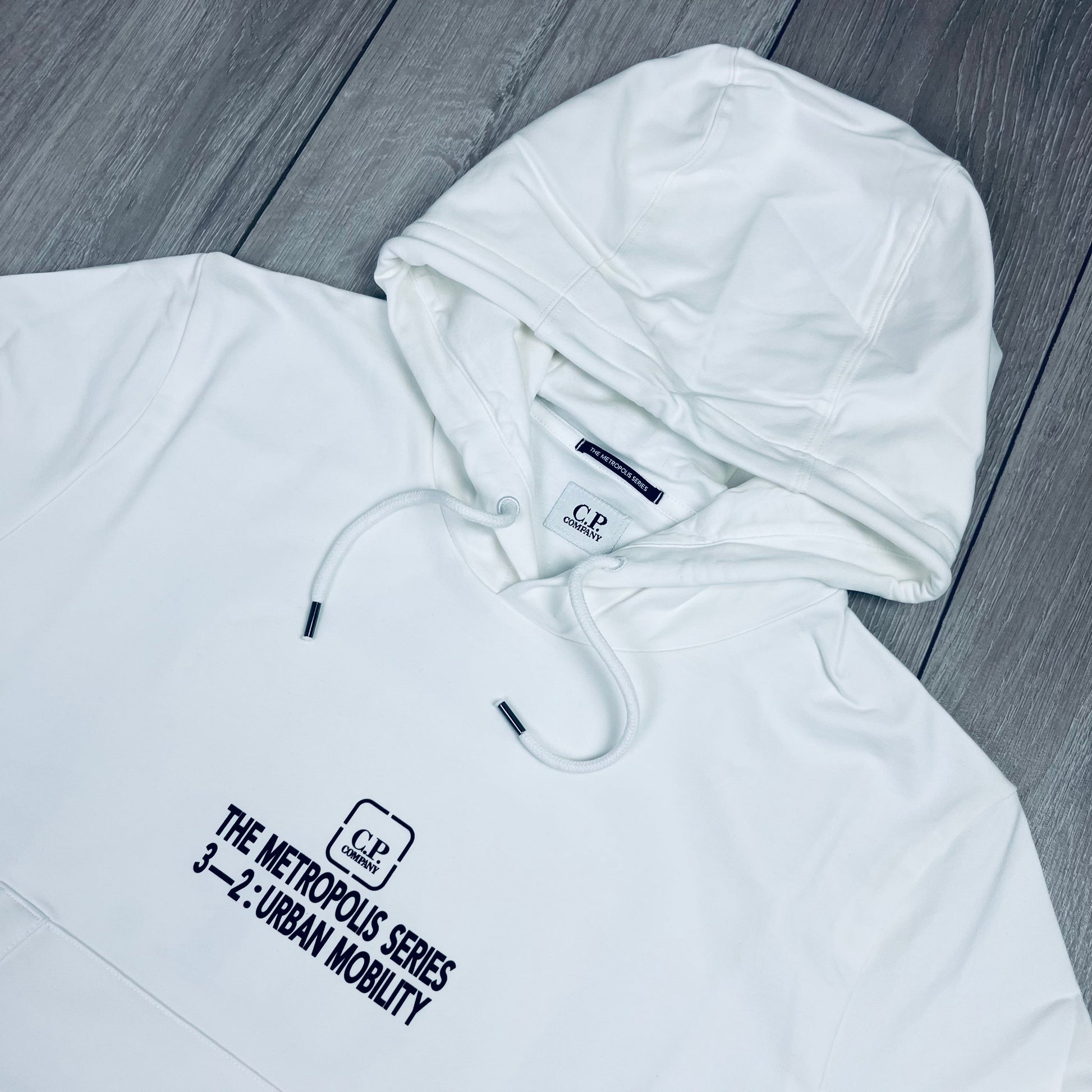 Gauze White CP Company Metropolis hoodie made from light fleece cotton with drawstring hood, kangaroo pockets and graphic print on the front and rear