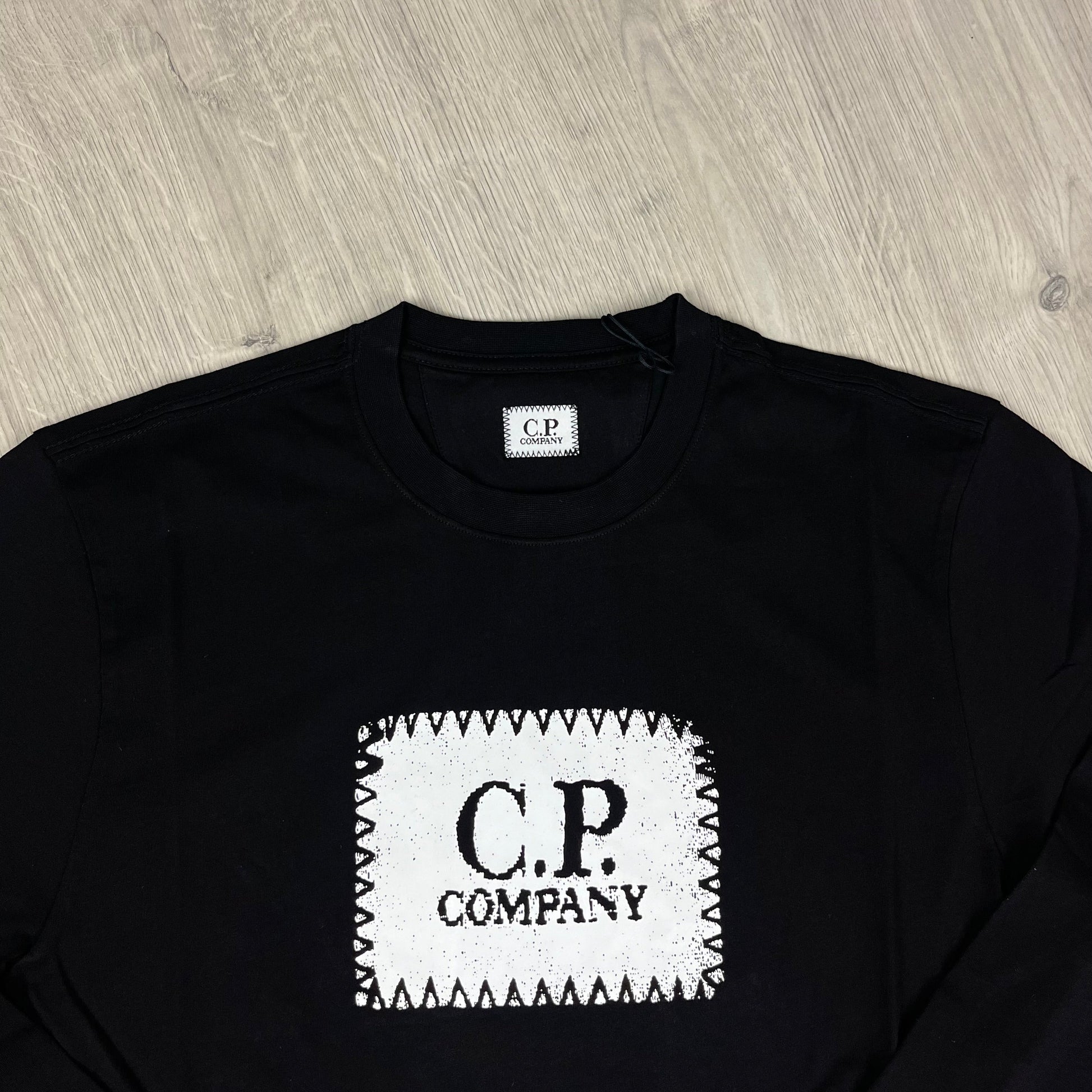 Black CP Company long-sleeve T-shirt with centrally printed box stamp logo in black.