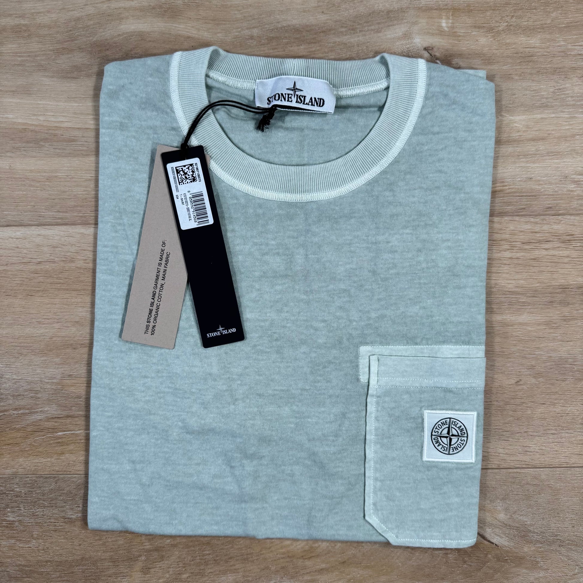 This Stone Island short-sleeve T-shirt is made from organic cotton jersey, garment dyed and finished with the FISSATO effect for a dry-touch feel. It features a ribbed neckline, overlock seams, and a chest pocket with the Stone Island Compass logo patch. Slim fit.