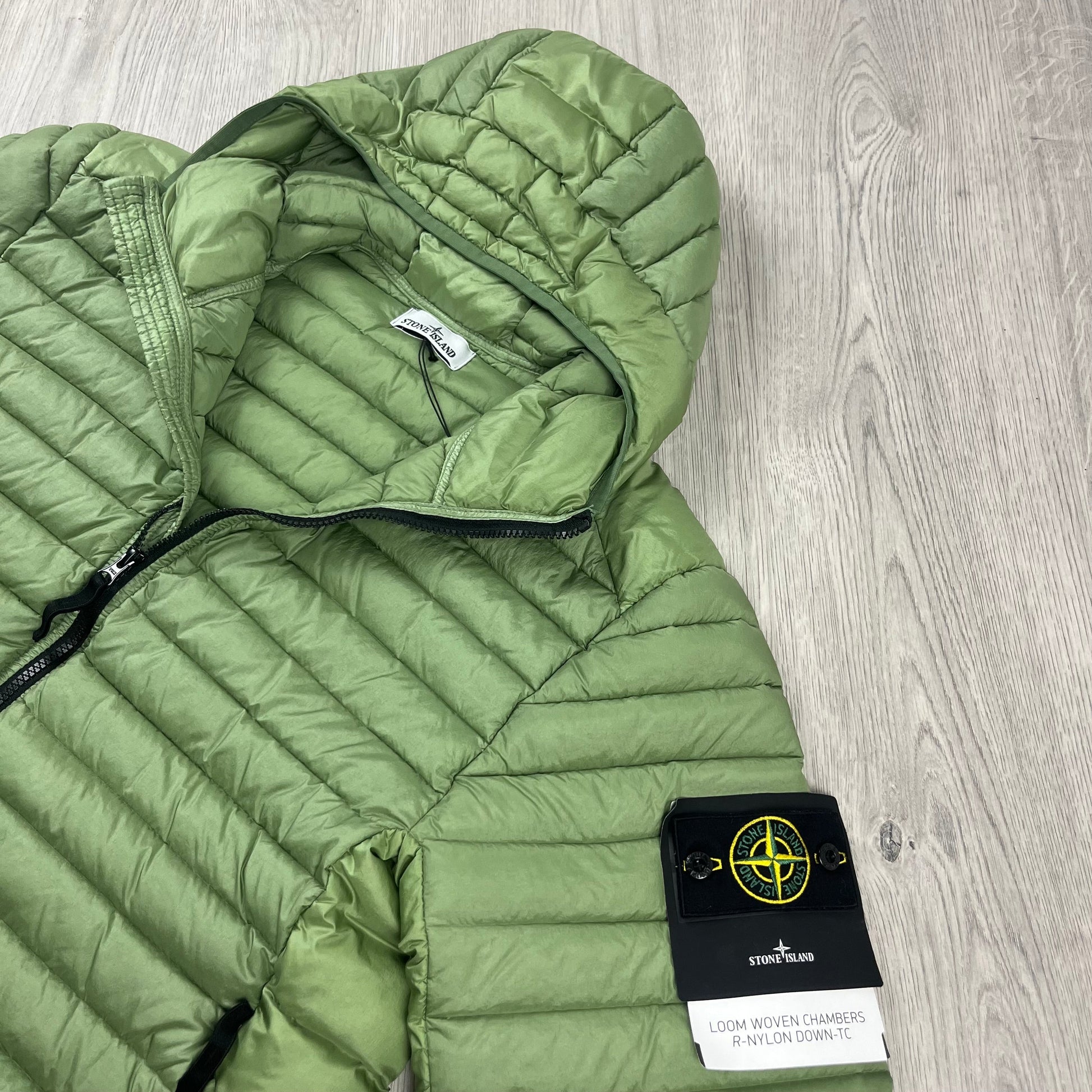 Sage Green Stone Island garment dyed loom woven down chambers stretch nylon-TC packable jacket with sleeve badge